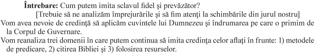 Urmează o secţiune de 10 minute, intitulată „Imitaţi-le credinţa, căci «scena acestei lumi este în schimbare»“. Bazându-se pe cuvintele lui Pavel din 1 Corinteni 7:31, scriitorii explică faptul scena lumii ‘aflată mereu în schimbare’ necesită ca „sclavul fidel şi prevăzător să facă schimbări din când în când cu privire la metodele noastre de predicare, la folosirea resurselor şi în înţelegere“. Astfel, se spune că el (Corpul de Guvernare) „urmează exemplul lui Isus Cristos şi se adaptează în mod înţelept la schimbări“.